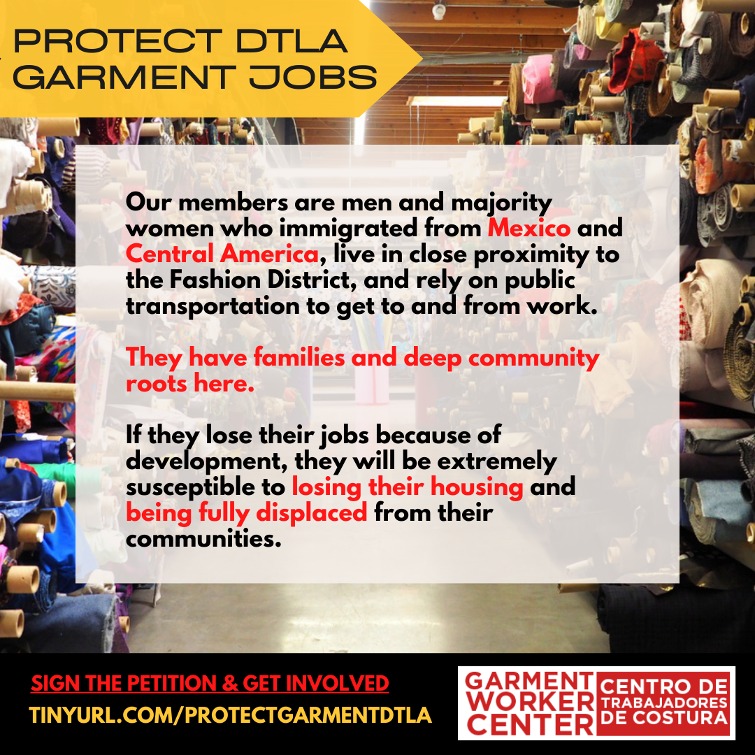 At the peak of the pandemic, LA’s garment professionals produced over 20M pieces of PPE when the US could get it nowhere else on the planet In 2021, California passed SB62 to ensure garment workers fair wages and rights. The DTLA 2040 Community Plan could upend these wins for workers and result in the closure of businesses who employ them. The pandemic exacerbated the already dire affordable housing crisis we are facing in Los Angeles. This plan only supports more unnecessary unoccupied luxury housing units at the expense of garment jobs and the unhoused.
